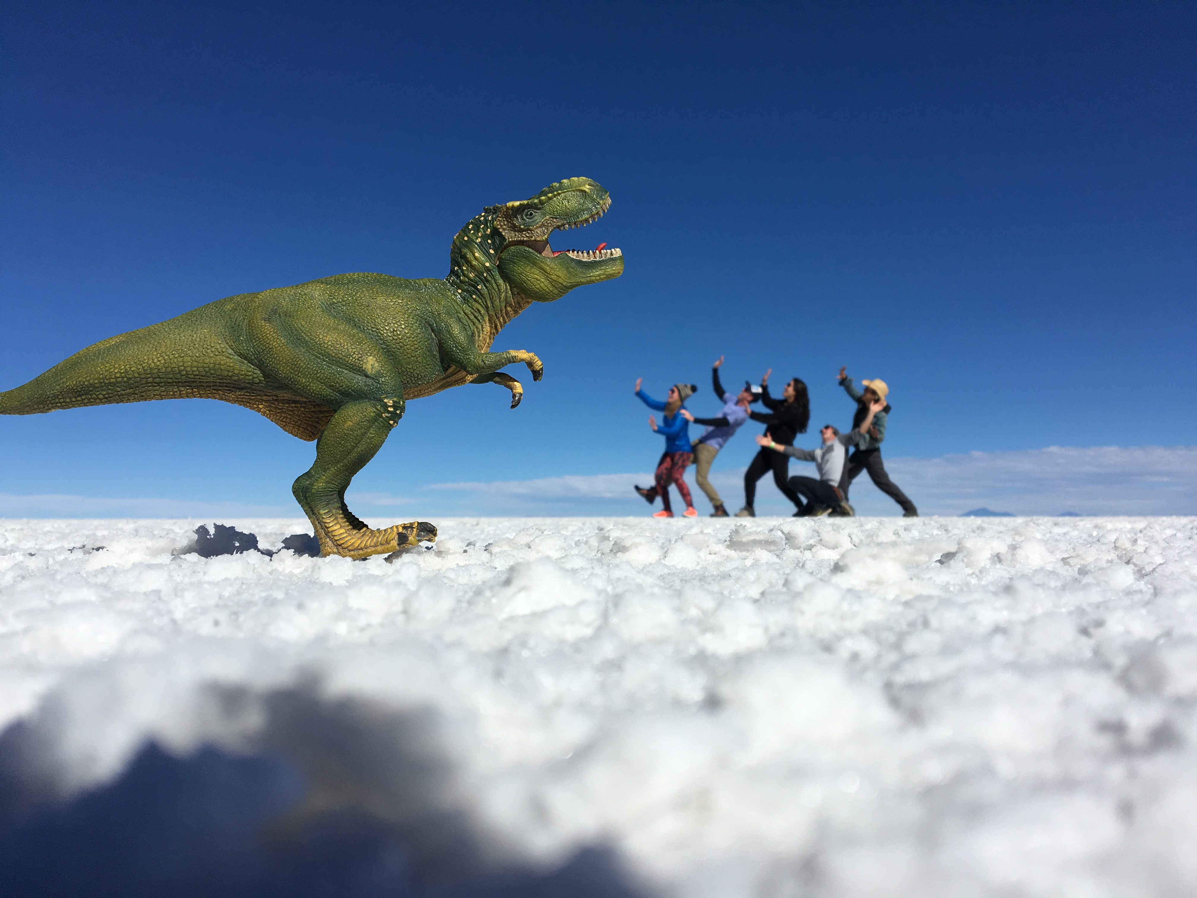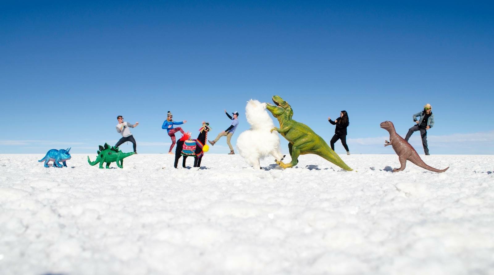 They chose a tour company called Estrella de Sur to take us to the Salar (salt flats) and to mountain lakes and the alleged only hotel made entirely of salt (really, how many could there be?). I’m not a good negotiator, but the other three were, and they saved us some bolivianos. Our driver, Ruben, took us straight to the Salar, which is practically indescribable. More than 4,000 square miles of salt, 100-times the size of the Bonneville Salt Flats in Utah. We had some fun with perspective and scale. And a small dinosaur. And a llama.